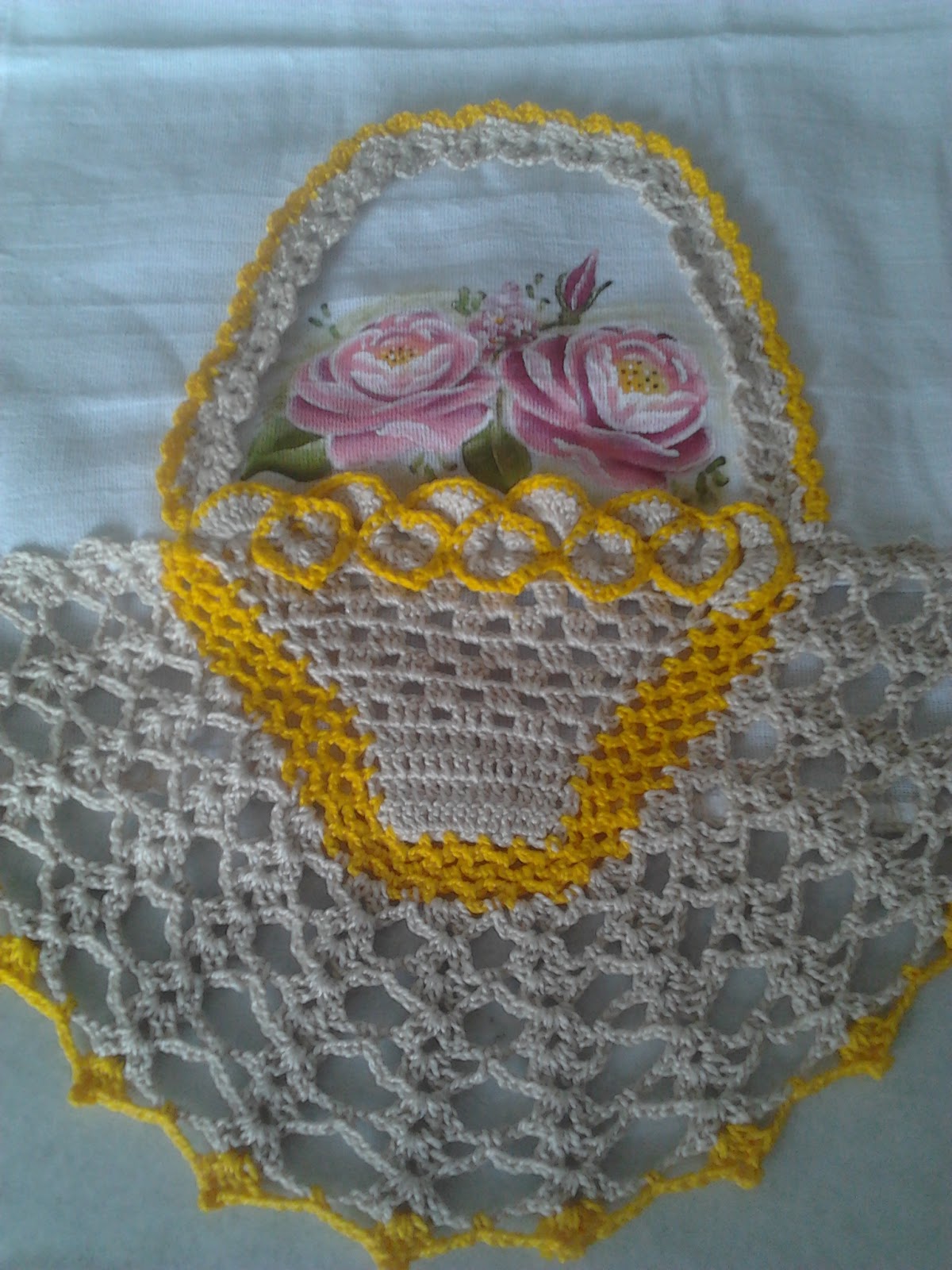 pano de prato com bico de cesta croche todo feito com fio anne da circulo nas cores bege e amarelo
