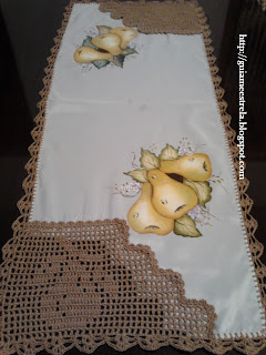 Caminho de mesa com pintura em tecido de peras,e bico de croche todo feito com o fio Anne da Circulo.