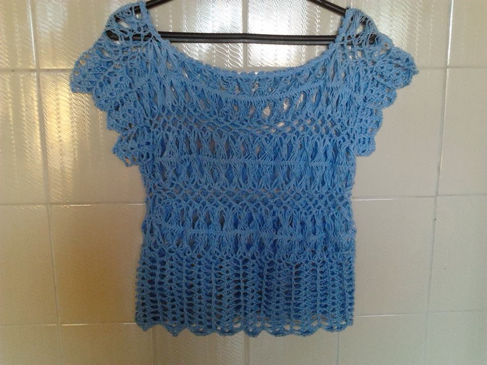 Blusa feita em croche de grampo com fio annena cor azul.